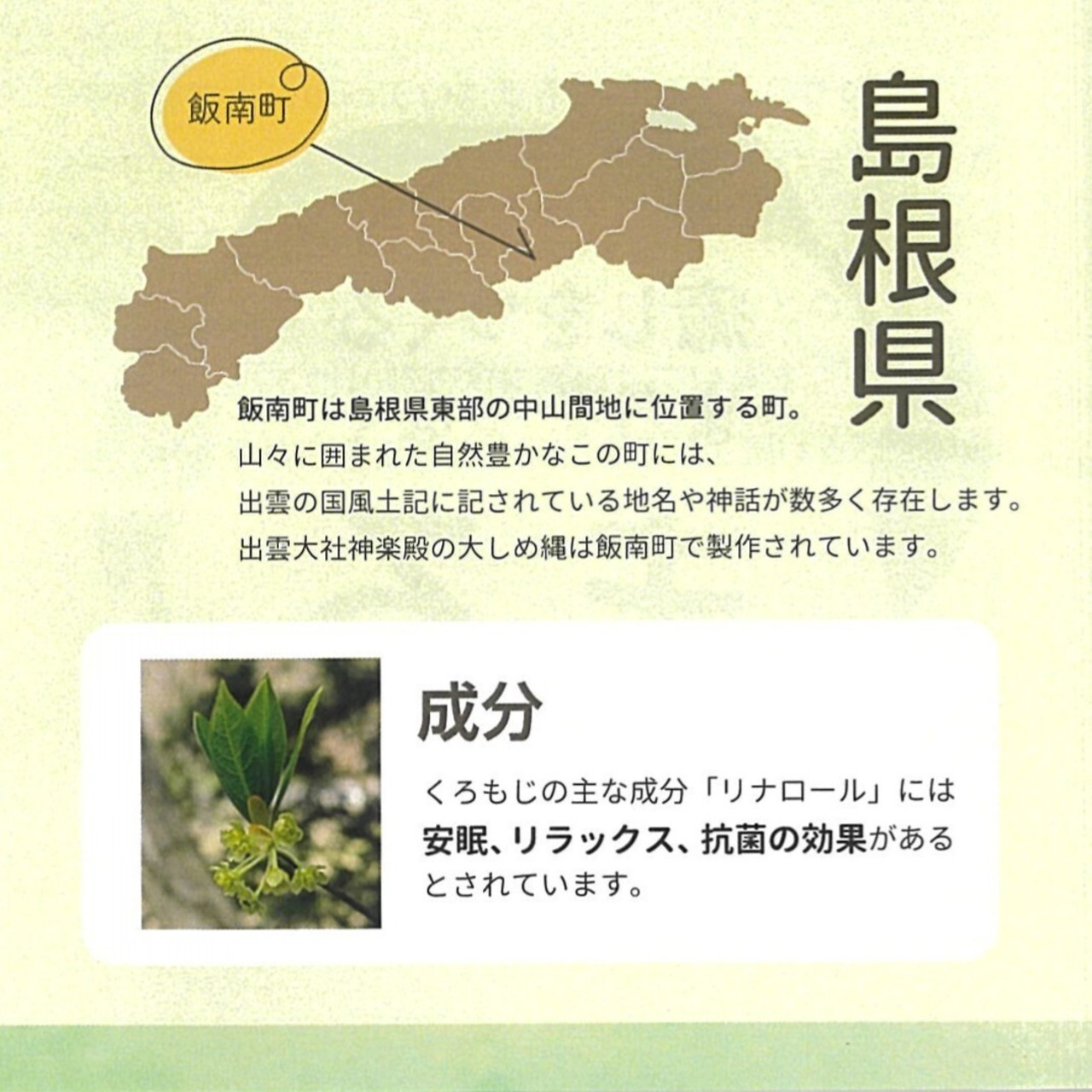 クロモジは関東~九州にかけて分布する香木で、高級楊枝の材料として知られています。豊かな森と共存する「森林セラピー®の町 飯南町」にも、たくさんのクロモジが自生しています。「まる」のくろもじは、主成分のリナロールなどの含有量が多いと言われる朝10時までに採取しています。